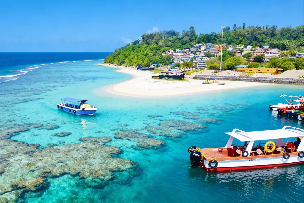 North Bay Island is a popular tourist destination near Port Blair, Andaman Islands, known for its vibrant coral reefs and clear waters.